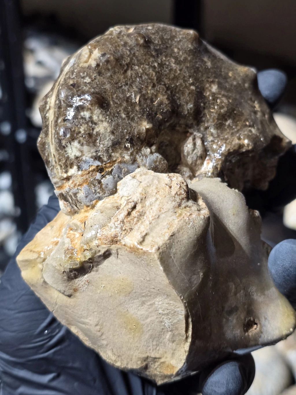 Amostra bruta de amonita fóssil. Foi aplicado verniz para proteger e realçar as estruturas.