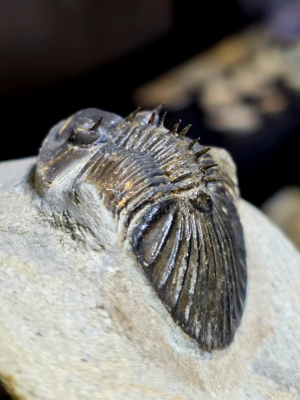 Esse trilobita incomum possui uma fileira de espinhos que parece um moicano, alem de espinhos nos olhos.